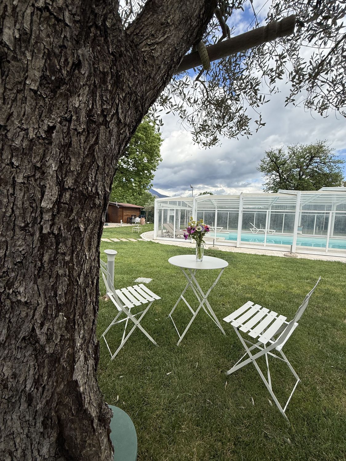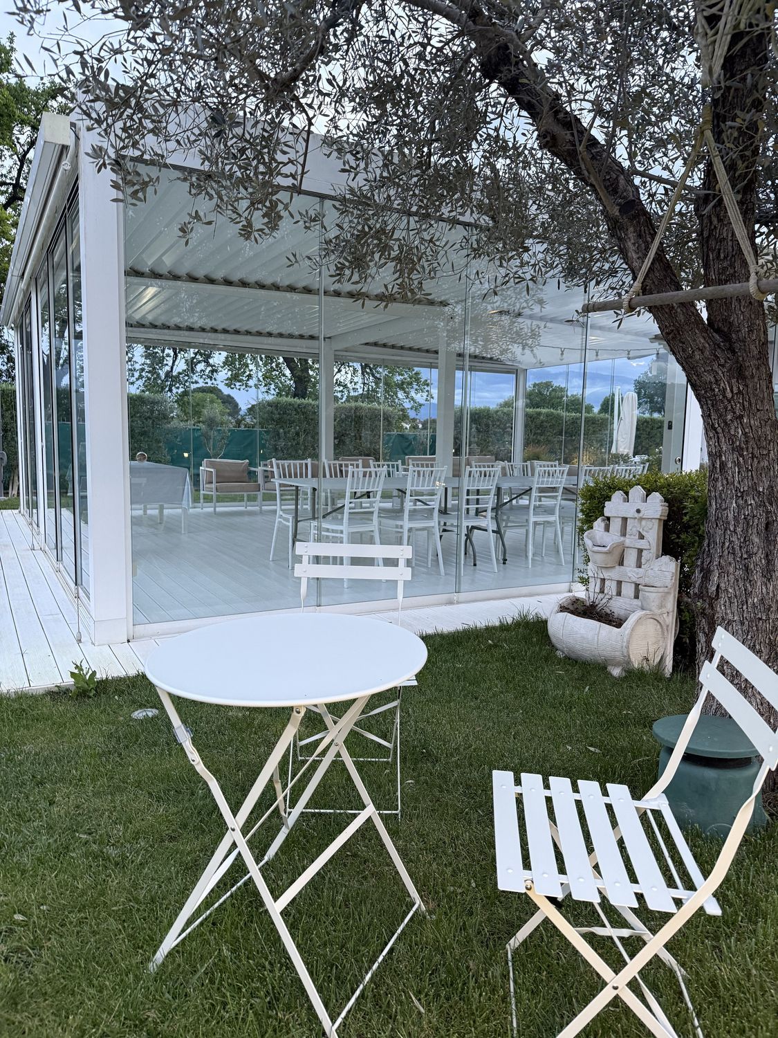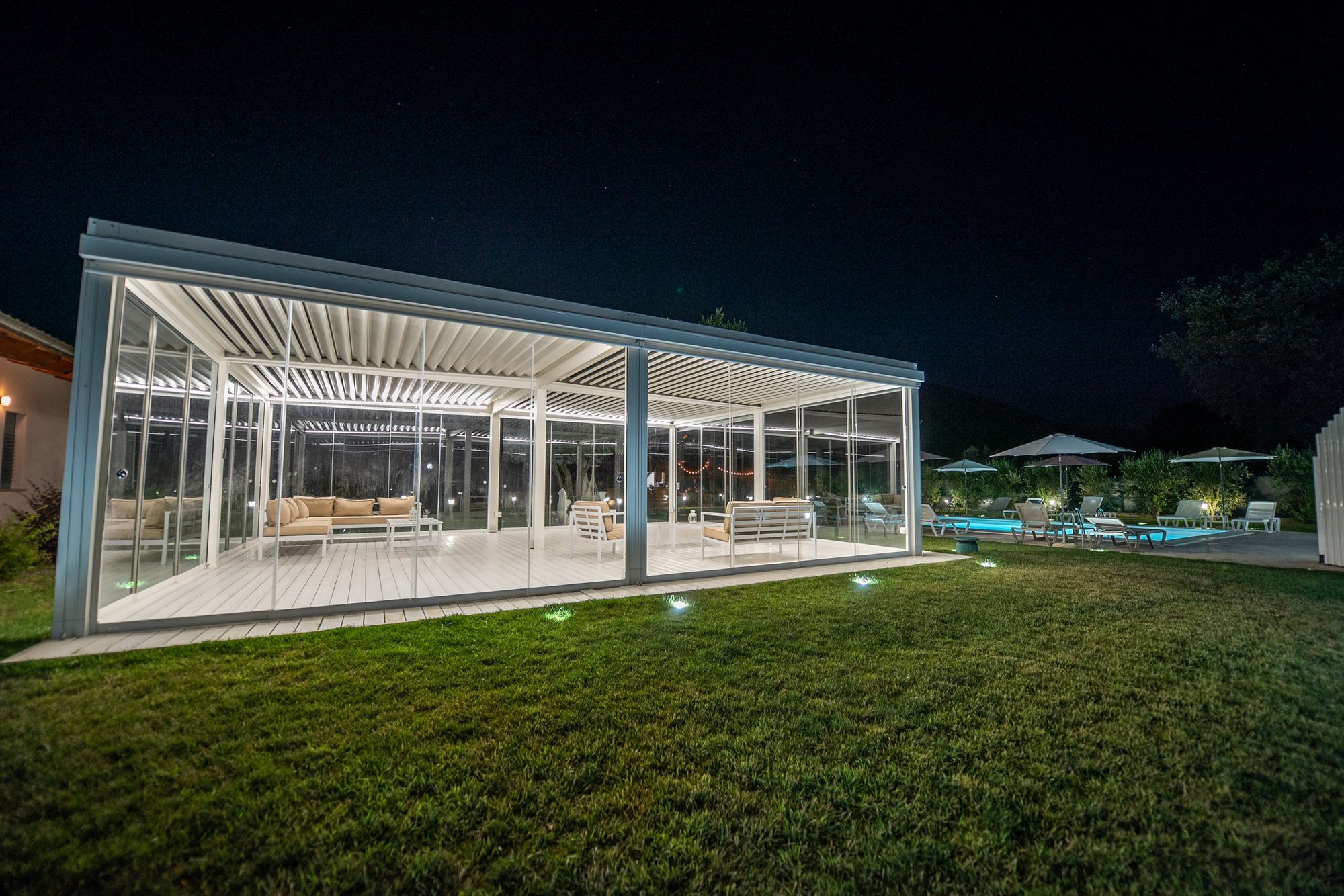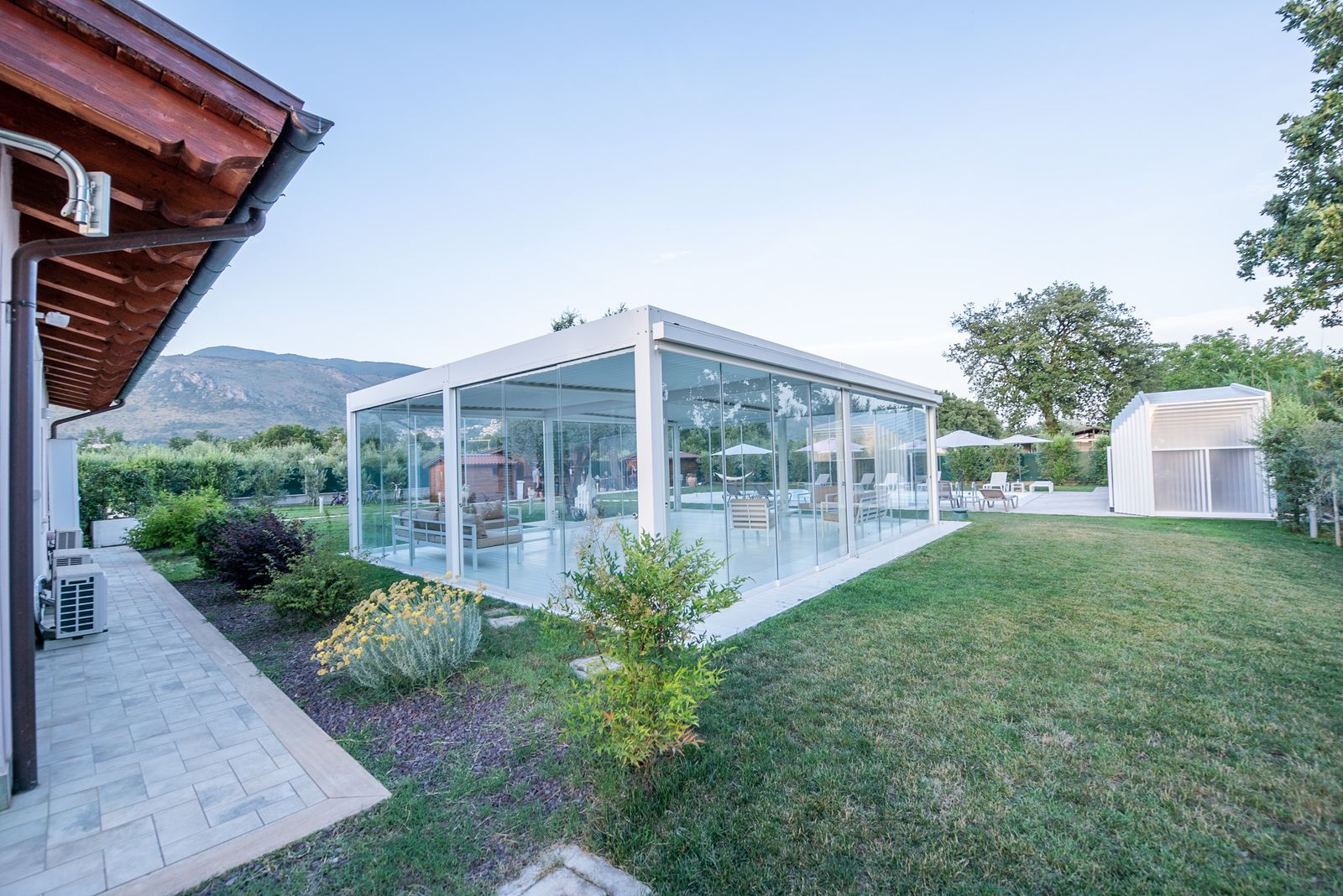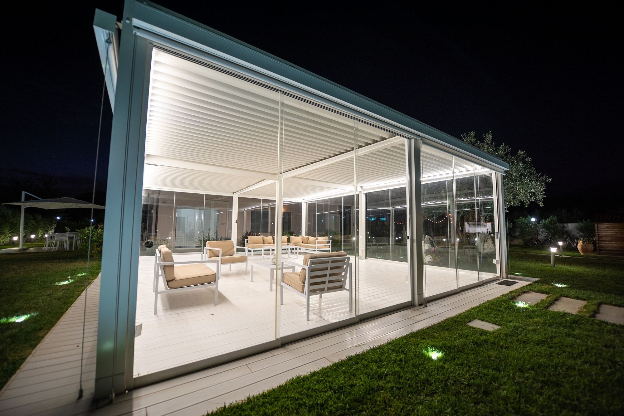 Nel giardino del Rifugio del Tempo, la pergola bioclimatica accoglie un ambiente pensato per il relax e la condivisione. Uno spazio luminoso e ordinato, che permette di vivere l’esterno in totale comfort, in ogni momento della giornata.