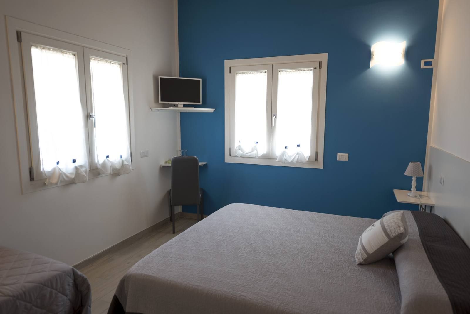 La camera dispone di bagno privato, TV, Wi-Fi e aria condizionata. Le due finestre affacciano sul giardino e sulla piscina, garantendo luce naturale e un’atmosfera piacevole e rilassante.