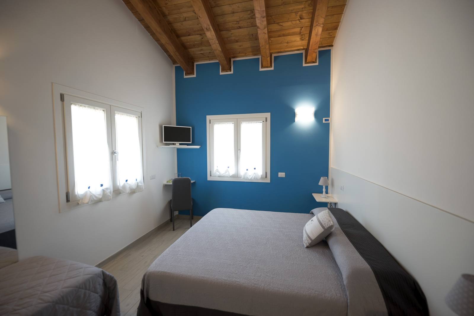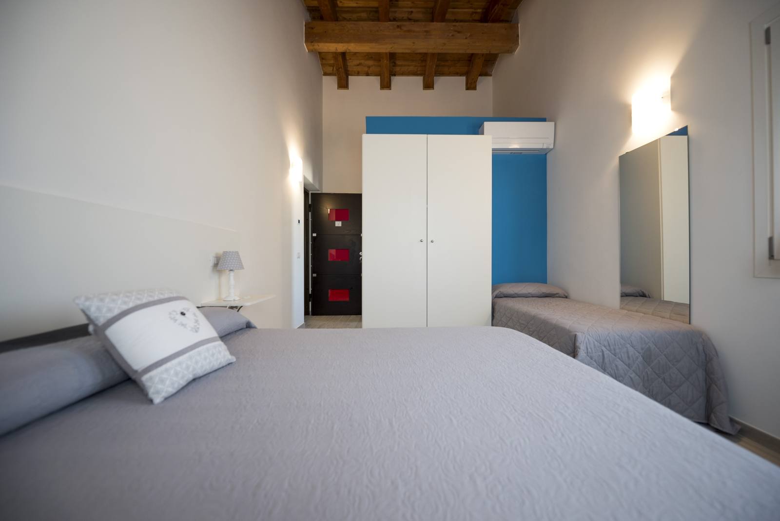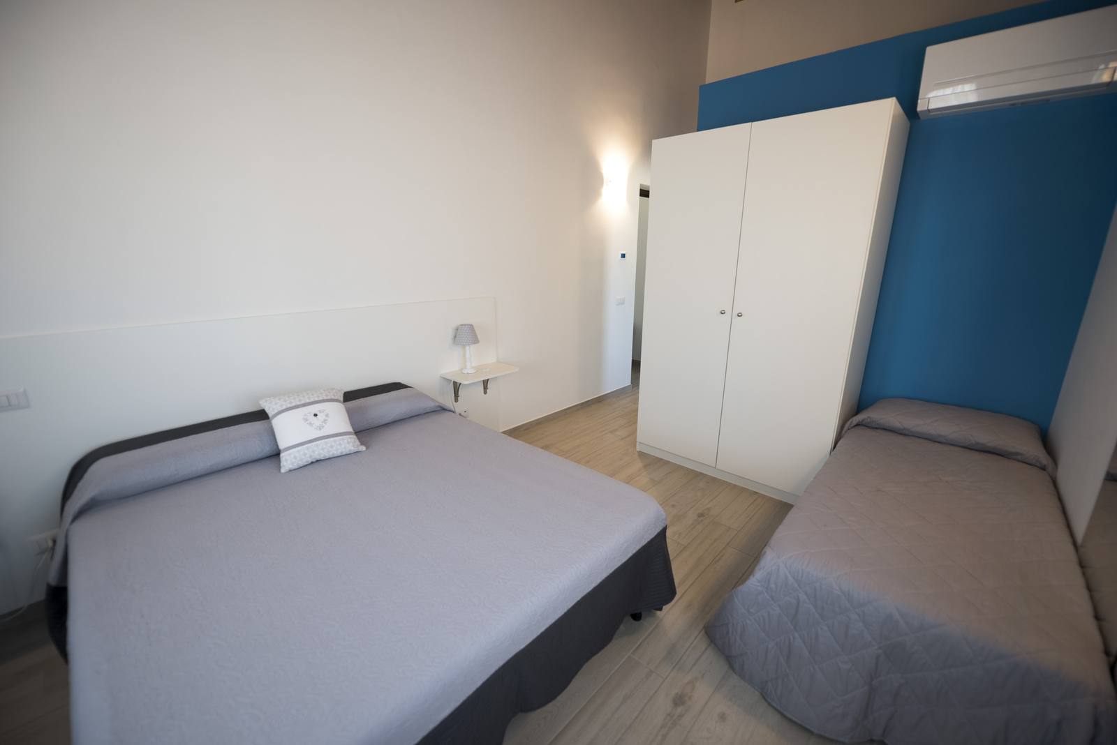 La disposizione con letto matrimoniale e letto singolo offre una soluzione pratica e confortevole per condividere il soggiorno in totale relax.